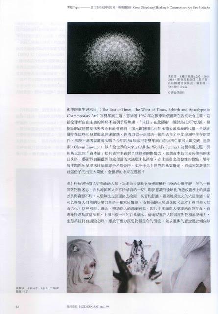 跨域的當代末日想像:"末日感性"的新媒體人文思維/ 作者:楊衍畇(策展人)/"現代美術"季刊, 2015年12月號, 北美館出版 Cross-Disciplinary Imagination for an Apocalypse: Humanistic Ideas and New Media Art in the Exhibition " The Apocalyptic Sensibility"/ Author: Yunnia Yang (Curator)/ The Quarterly Journal " Modern Art", published by Taipei Fine Art Museum, December 2015.